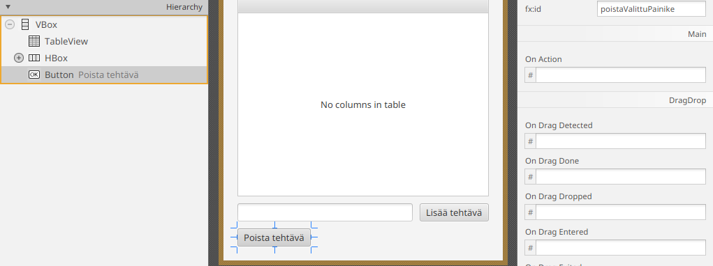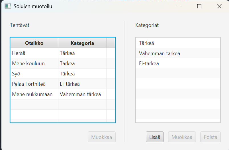 Nyt kategoriatieto kyllä päivittyy tehtäviin, mutta muutos ei näy heti TableView-oliossa, koska kategoria-sarake kuuntelee vain kategorian viitteen muutoksia.